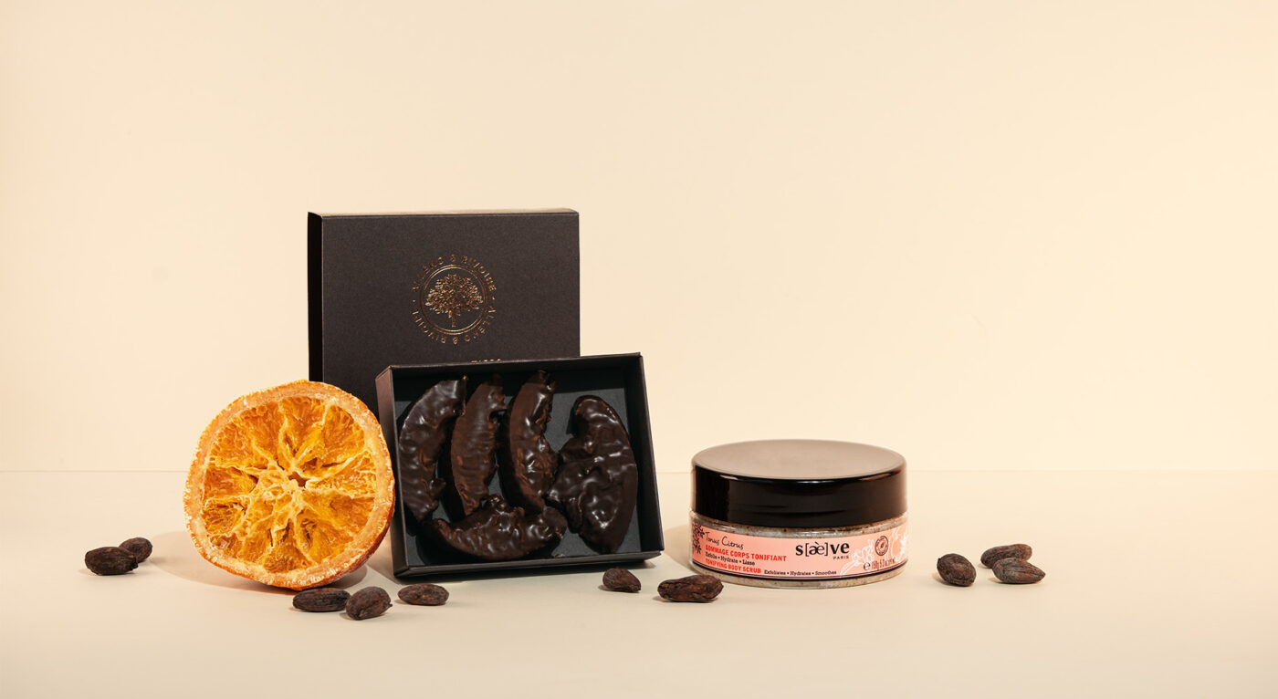 Composé d’un confit de pamplemousse chocolaté Alléno & Rivoire et d’un gommage corps Tonus Citrus Saeve aux grains de sucre et copeaux de noyaux d’abricots upcyclés, ce coffret a le parfum du printemps et la fraîcheur des fruits. Les confits de fruits Alléno & Rivoire, sans sucre et travaillés à l’eau de bouleau, sont le symbole de la confiserie moderne pensée par les deux Chefs. Pour créer les confits de pamplemousse, Aurélien Rivoire emploie des fruits cueillis à pleine maturité : « grâce à l’eau de bouleau, ils acquièrent ensuite une toute nouvelle texture, et les saveurs du fruit s’en trouvent concentrées. C’est une toute autre manière de découvrir et de savourer la beauté des fruits », explique-t-il. Les quartiers de pamplemousse sont ensuite recouverts d’une fine couche de chocolat… un pur délice ! Le gommage Corps Tonus Citrus SAEVE allie lui aussi le meilleur des fruits en upcyclant les copeaux de noyaux d’abricot délaissés par l’agroalimentaire dans la production de compotes et jus, des cristaux de sucre issus des betteraves sucrières et bien sûr, formulé sans eau grâce à la sève de bouleau BIO sourcée au cœur du massif des volcans d’Auvergne. Sa texture transformative se fond en lait au contact de l’eau et permet un gommage parfait et un rinçage facile. Il laisse la peau douce et hydratée.