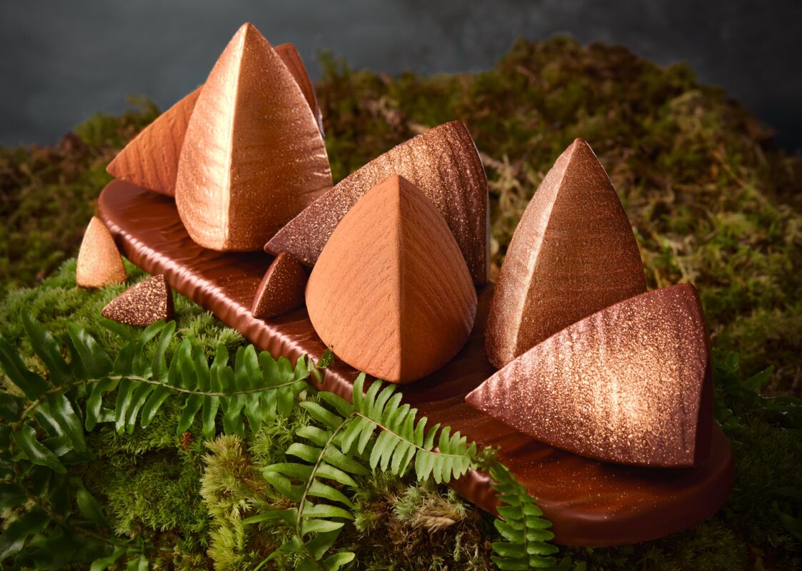 La toute première bûche Alléno & Rivoire révèle six berlingots en fines coques de chocolat noir. A l’intérieur, on découvre un cœur de cacao cru et une divine mousse au chocolat, en jeu de texture avec un biscuit aux éclats cacaotés de sablés breton. A déguster en trois temps, on poursuit par les petits berlingots (juste pour la gourmandise), puis par le croustillant praliné sans sucre aux zestes de citron vert, à partager au moment du café !