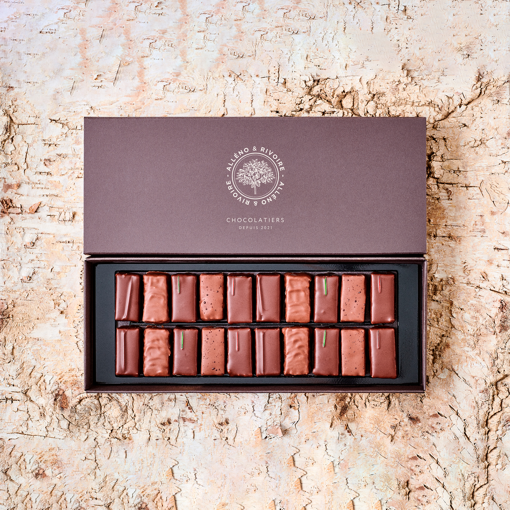 Chocolat au lait bitter (39% de chocolat min) (contient sucre, beurre de cacao, lait entier en poudre, fèves de cacao, émulsifiant: lécithine de tournesol, extrait naturel de vanille), amandes, avec édulcorant xylitol (E967), noisettes, noisette (noisettes), noix de pécan, Chocolat noir de couverture Equateur (55% de chocolat min) (contient fèves de cacao d’Equateur, beurre de cacao, sucre, lécithine de tournesol, extrait naturel de vanille), noix de coco, graines de lin, beurre de cacao, sel, colorant alimentaire (E129, E132, E102), colorant alimentaire (E129), colorant alimentaire (E102, E133).
