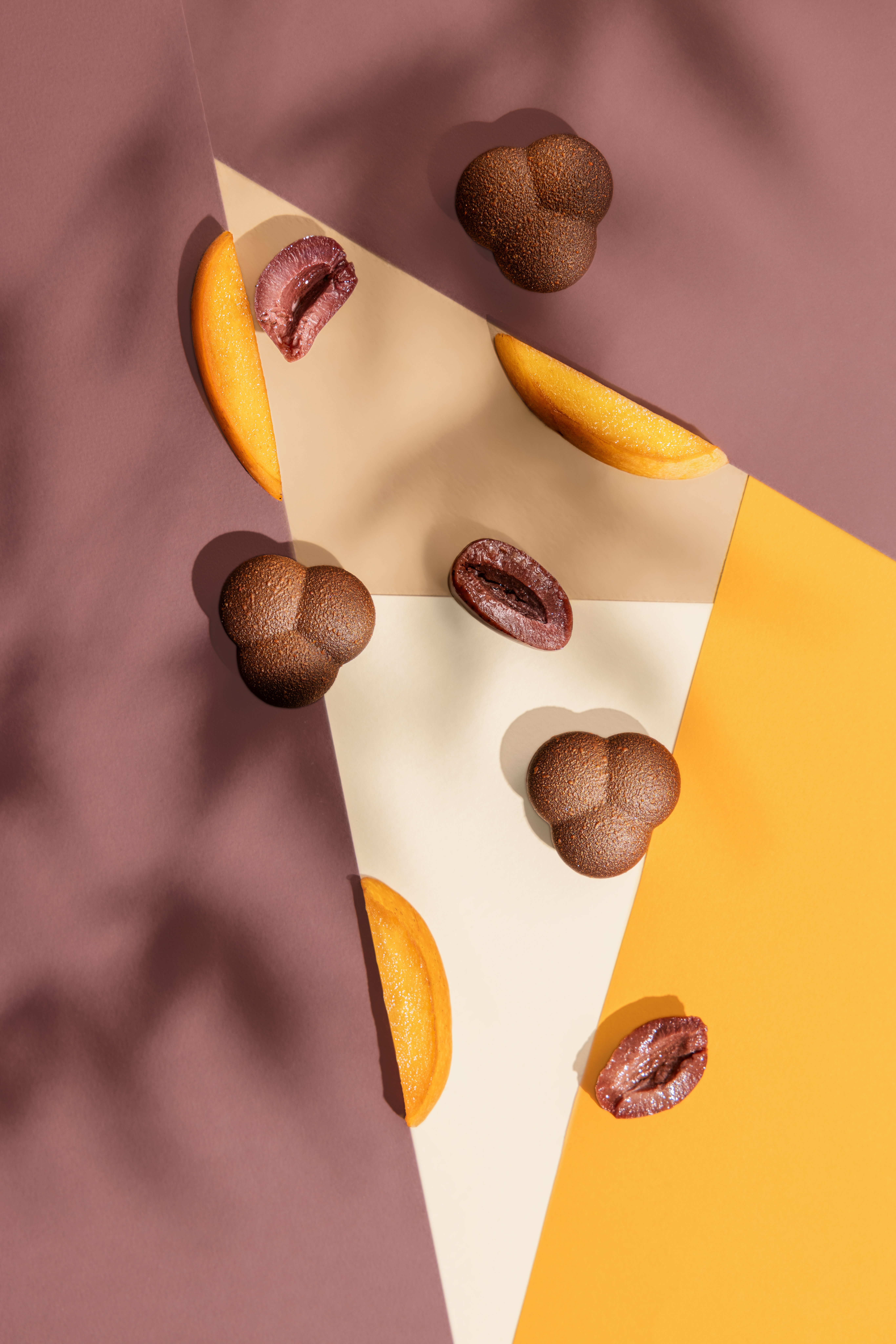 Chocolat noir 65% Xocoline (contient : fève de cacao, maltitol, beurre cacao, lécithine de tournesol, extrait naturel de vanille) (lait, soja), abricot, fèves de cacao du Pérou, lait en poudre, beurre de cacao, lécithine de tournesol bio, fleur de sel), noisette (noisettes), olive de Kalamata, Colorant alimentaire (E110), Xylitol (E967), Crème liquide 35% (contient crème de lait, stabilisant: carraghénanes extraits d’algues marines), miel, lait, huile d’olive 03, sel, Chocolat Lait 41% Xocoline (contient: maltitol, beurre de cacao, lait entier en poudre, fève de cacao, extrait naturel de vanille, émulsifiant, lécithine de tournesol.)